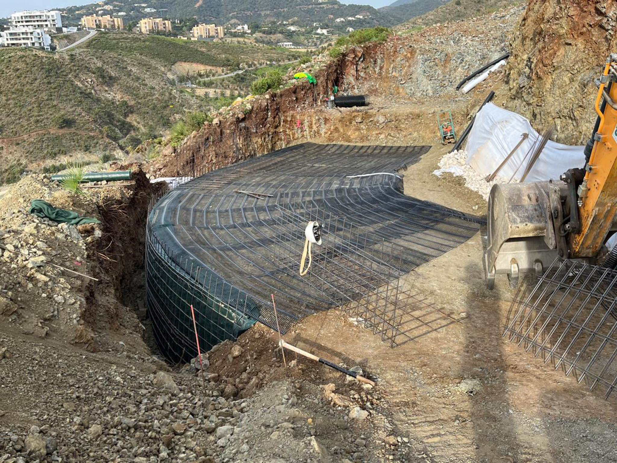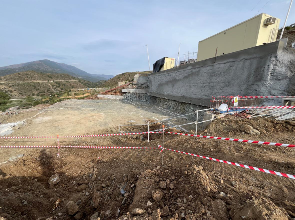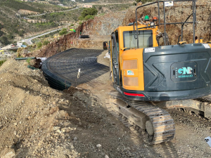 The first ecological wall cells have now been installed in lowest point in the plot. You can see the way in which the cells are constructed, using reinforced steel sheets (bent into L-Shapes) and then backfilled with excavated earth and rocks. Each cell is 50cm high, with rock being compacted in layers.