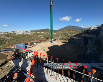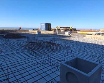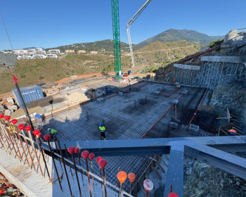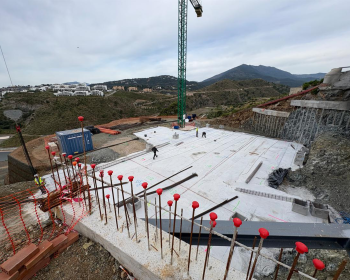 The basement slab steelwork is now complete, with the following photos showing the overall basement, plus the swimming pool that will jut outwards from the villa with views towards Gibraltar. A photo the following day shows the completed concreting of the basement floor slab. Work now stars on the basement…