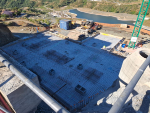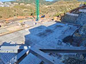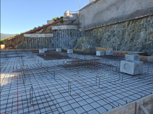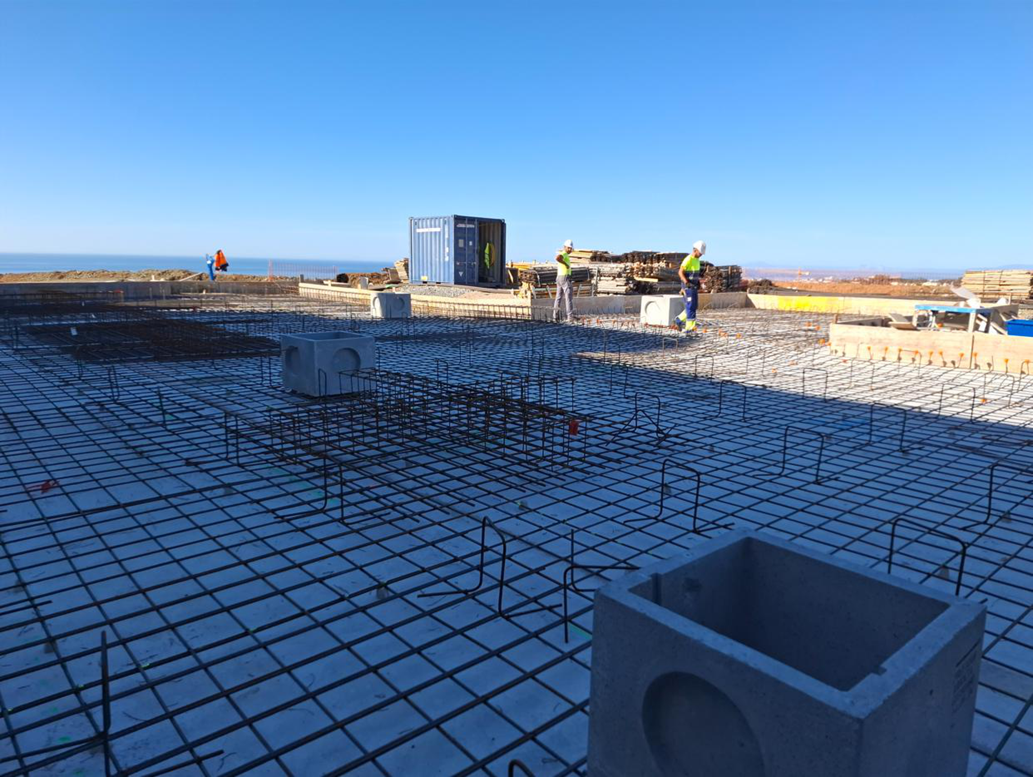 The lower level of reinforcing steel sheets have been laid, along with the drainage collector blocks.